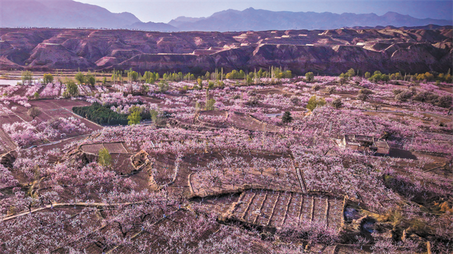 An aerial view of apricot blossoms in Dongxiang Autonomous County in Linxia Hui Autonomous Prefecture, Northwest China's Gansu Province Photo: VCG