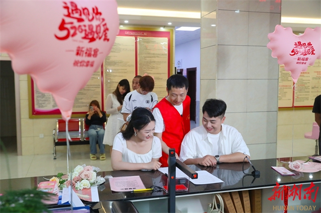 On May 20, a volunteer guided couples to go through marriage process at the Marriage Registration Center of Xintian County Civil Affairs Bureau. May 20, or "520", holds significance as its pronunciation is similar to "I love you" in Chinese. Many couples choose to register for marriage on this day. (Photo/Liu Guixiong)