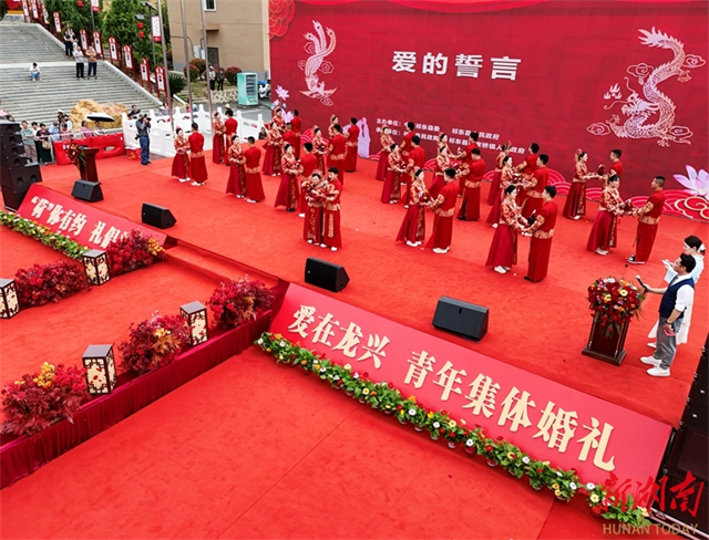 On May 20, the newlyweds walked into the wedding site hand in hand at the Jiuyi Mountain Scenic Area in Ningyuan County. A traditional Chinese collective wedding ceremony was held in Yongzhou City on the same day. Thirty-one couples in stunning Chinese costumes exchanged vows, signed marriage certificates, and tied symbolic knots, promoting a new style of wedding customs. (Photo/Huang Chuntao and Li Wen)