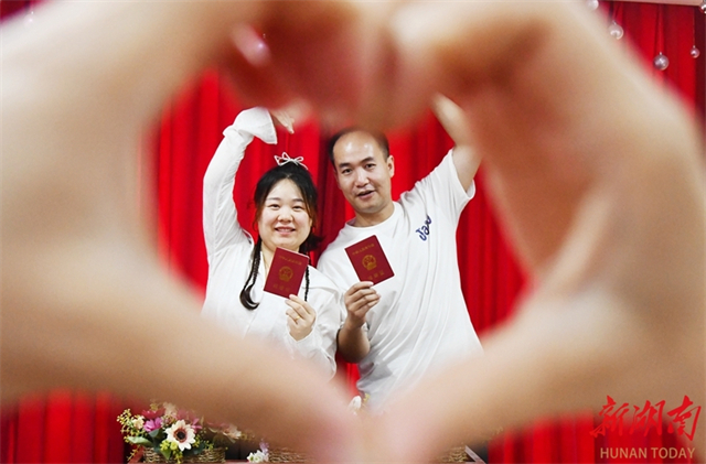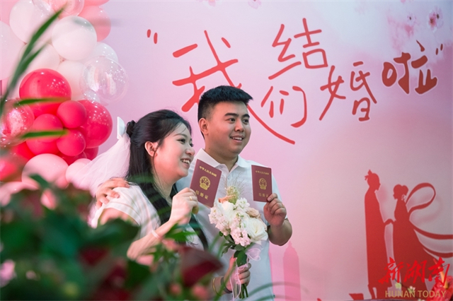 On May 20, a couple took pictures with their marriage certificates at the Marriage Registration Center of Liuyang Civil Affairs Bureau. May 20, or "520", holds significance as its pronunciation is similar to "I love you" in Chinese. Many couples choose to register for marriage on this day. (Photo/He Zailiang)