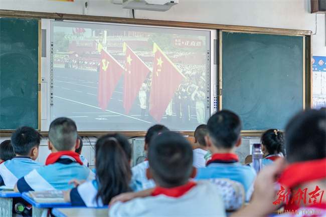 Faculty and students of Guipanyuan School in Qiaotouhe Town, Lianyuan City, watch the live broadcast of the V-Day military parade together on September 3. (Photo/Zhang Yang)