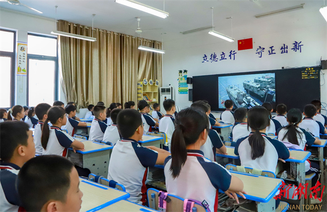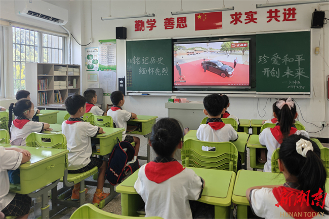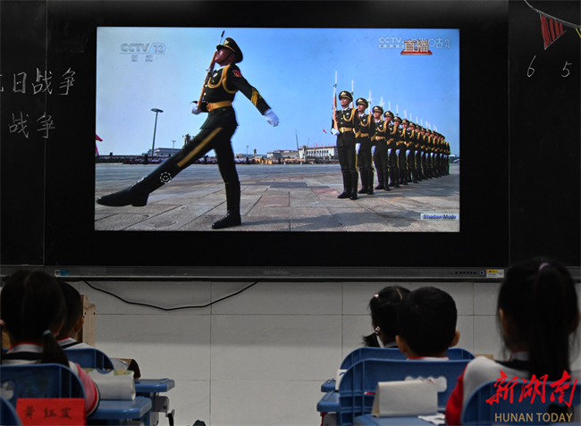Students of the Free Trade Zone Port Area Experimental School in Changsha watch the live broadcast of the V-Day military parade together on September 3. (Photo/Chang Sichuang)