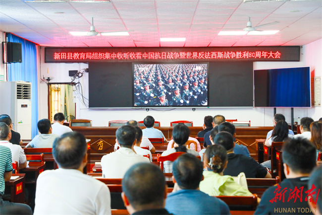 Working staff and cadres gather to watch the live broadcast of the V-Day military parade at the Education Bureau of Xintian County on September 3. (Photo/Liu Guixiong and Chen Zhining)