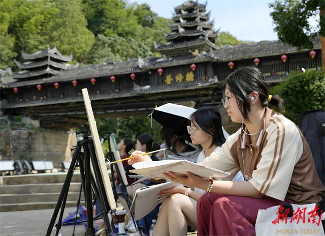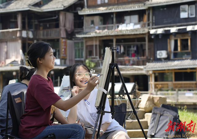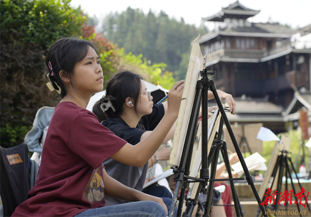 The photo shows art students sketching at the Huangdu Dong Cultural Village in Tongdao Dong Autonomous County. In recent years, the scenic area has taken measures to revitalize intangible cultural heritage, promote vibrant cultural performances, and strengthen ties with neighboring villages. These efforts have given rise to new business models such as cultural innovation, homestays, and study tours, attracting visitors from all over the country and breathing new life into the ancient Dong village. (Photo/Li Shangyin)