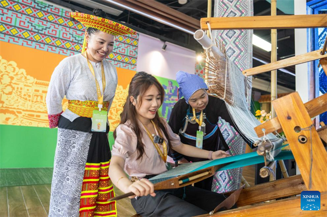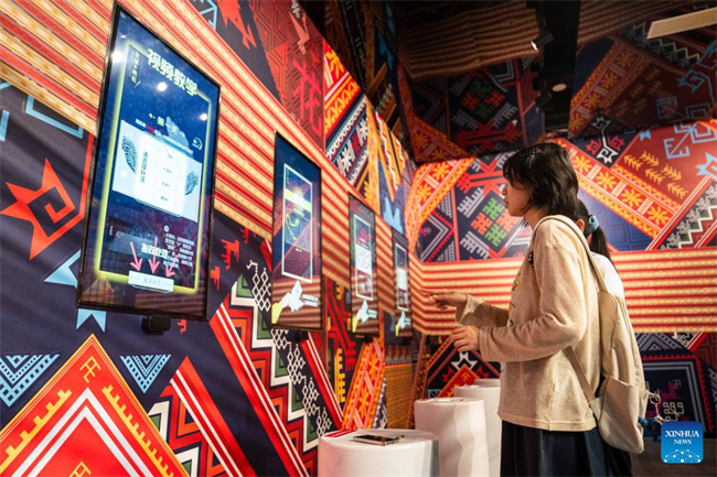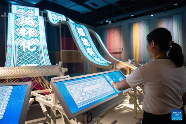 A visitor learns about brocade weaving techniques of the Dong ethnic group at the Wuxi Intangible Cultural Heritage Park in Hecheng District, Huaihua, central China's Hunan Province, Sept. 16, 2025.