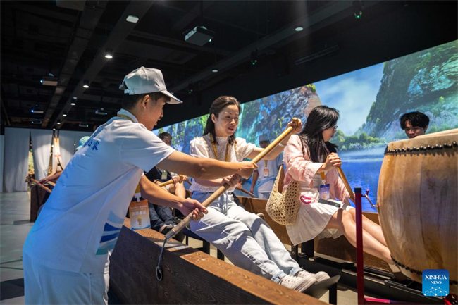 People experience dragon boat rowing at the Wuxi Intangible Cultural Heritage Park in Hecheng District, Huaihua, central China's Hunan Province, Sept. 16, 2025.