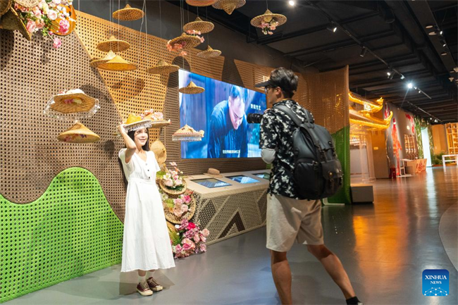 A visitor tries on a hat made of bamboo at the Wuxi Intangible Cultural Heritage Park in Hecheng District, Huaihua, central China's Hunan Province, Sept. 16, 2025.