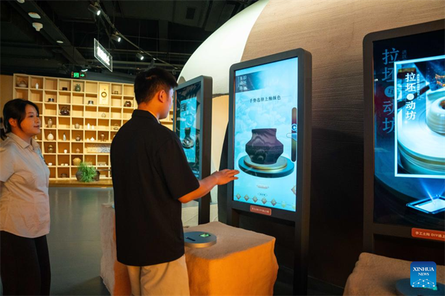 A visitor learns about pottery making techniques at the Wuxi Intangible Cultural Heritage Park in Hecheng District, Huaihua, central China's Hunan Province, Sept. 16, 2025.