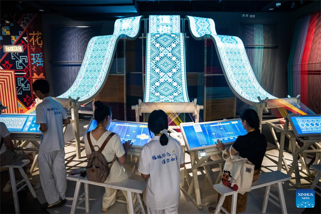 People learn about brocade weaving techniques at the Wuxi Intangible Cultural Heritage Park in Hecheng District, Huaihua, central China's Hunan Province, Sept. 16, 2025.