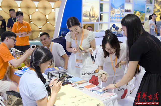 Within the Hunan Pavilion, a range of intangible cultural heritage products and cultural tourism commodities with distinctive Hunan characteristics were on diplay, such as Xiang embroidery, Liuyang fireworks, chrysanthemum stone carvings, Liling porcelain, Miao embroidery, Tujia brocade, Nvshu works, and Anhua dark tea, which attracted numerous visitors who stopped to admire them. The pavilion also came alive with a series of performances, including the group dance "Yao Village Charm," the flower-drum opera "Liu Hai Cuts Firewood," the solo song "Spicy Girl," and the interactive parade "Elegance of Tang Dynasty."