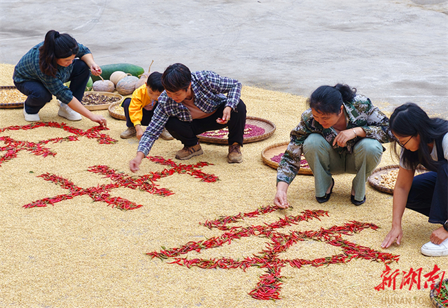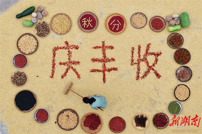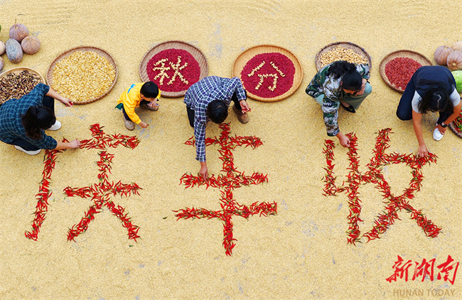 On September 22, villagers use chili peppers and corns to form Chinese characters "庆丰收 (celebrate harvest)" to mark the eighth Chinese Farmers' Harvest Festival at Quanfeng Village, Jinping Town, Jiahe County.