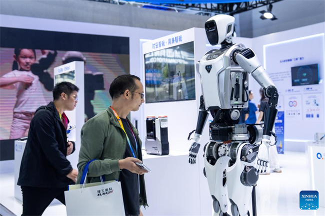 A visitor (2nd R) learns about a humanoid robot displayed at the 4th International Summit on BDS Applications in Zhuzhou, central China's Hunan Province, Sept. 24, 2025. The 4th International Summit on BDS Applications kicked off here on Wednesday.