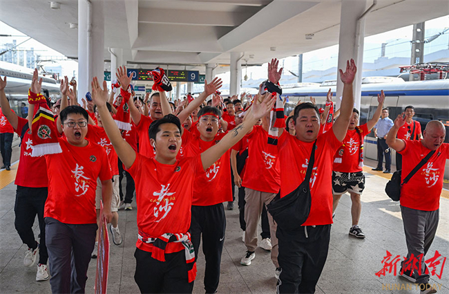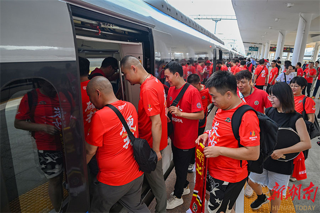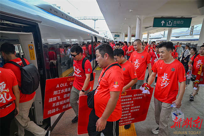 The Changsha-Zhuzhou-Xiangtan (CZT) Intercity Railway launched a special train for the 2025 Hunan Football League, or "Xiangchao," at 15:02 on September 28. The train, numbered S6943, arrived at Bantang Station, Xiangtan at 15:50 that afternoon. Return train service is also arranged to facilitate football fans' travels among Changsha, Zhuzhou, and Xiangtan cities. The photo shows football fans from Changsha taking the special train to watch matches in Xiangtan. (Photo/Guo Liliang, Hunan Daily)