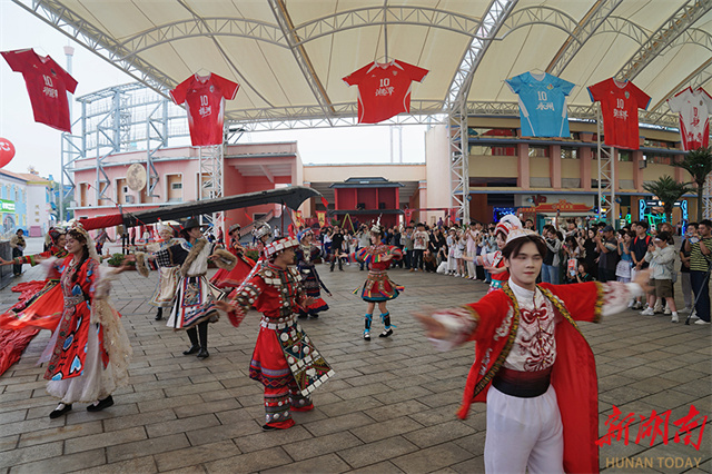 On September 29, a National Day celebration featuring spectacular skills kicked off at the Window on the World, Changsha. Intangible cultural heritage performances such as the duo high-pole stunts and Miao ethnic group's "Walking on Blades" were staged one after another. Joining spherical cinema, and other modern tech experiences, they created a festive feast that blends tradition and innovation for tourists. (Photo/Xu Xing, Hunan Daily)