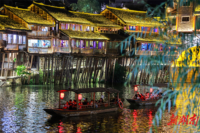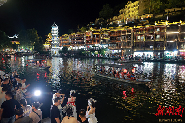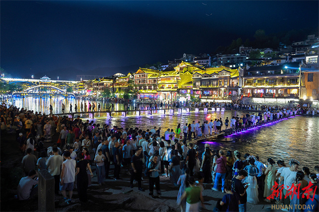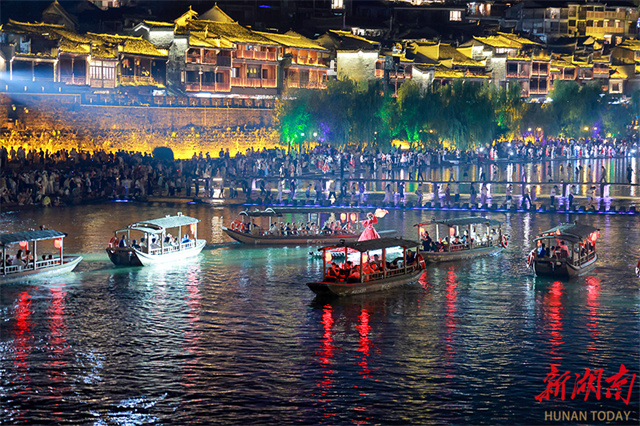The banks of the Tuojiang River in Fenghuang Ancient Town were illuminated by brilliant lights. Tourists enjoyed boat rides at night, stopped to take photos, and fully immersed themselves in the town's nightscape. During the National Day holiday, the scenic area introduced new nighttime tourism activities, allowing visitors to fully experience the folk culture of western Hunan and its beautiful natural scenery. (Photo/Teng Shuming)