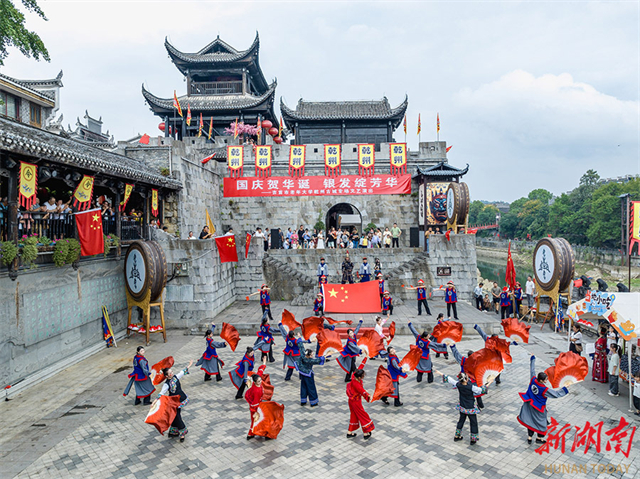 Recently, visitors watched a flash mob performance at the Qianzhou Ancient Town Scenic Area, Jishou City, in celebration of the National Day and the Mid-Autumn Festival. The scenic area has launched a series of activities including a red or revolutionary culture exhibition, intangible cultural heritage performances, and traditional Chinese style experiences. The immersive performances and folk custom presentations have attracted numerous visitors. (Photo/Peng Jing)