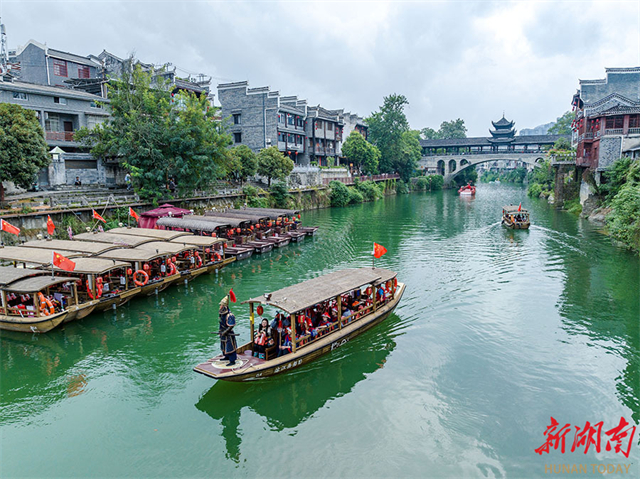 Recently, tourists took a boat ride on the Wanrong River, Qianzhou Ancient Town Scenic Area, Jishou City, in celebration of the National Day and the Mid-Autumn Festival. The scenic area has launched a series of activities including red or revolutionary culture exhibition, intangible cultural heritage performance, and traditional Chinese style experience. The immersive performances and folk custom presentations have attracted numerous visitors. (Photo/Peng Jing)