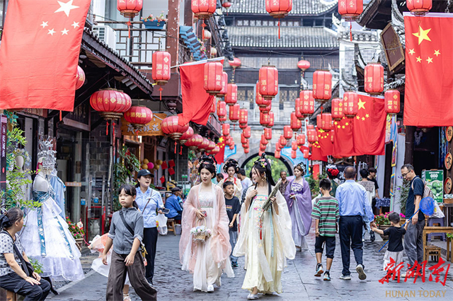 Recently, visitors had fun at the Qianzhou Ancient Town Scenic Area, Jishou City, in celebration of the National Day and the Mid-Autumn Festival. The scenic area has launched a series of activities including a red or revolutionary culture exhibition, intangible cultural heritage performances, and traditional Chinese style experiences. The immersive performances and folk custom presentations have attracted numerous visitors. (Photo/Peng Jing)