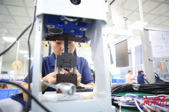 On October 9, workers produce wire rod at full capacity on the production lines at the workshop of an auto parts company in Longhui High-Tech Industrial Development Zone. Following the end of the National Day and Mid-Autumn Festival holiday, enterprises across Longhui County have ramped up production for the fourth quarter. (Photo/Zeng Yong and Ning Qifeng)