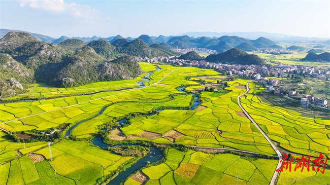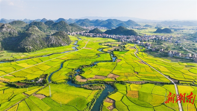The photo, taken on October 10, shows paddy rice ripening in succession in a 10,000-mu (667 ha.) selenium-rich rice plantation in Shiyang Town, Xintian County. The vast paddy fields interweave with rivers, villages, and country roads, creating a beautiful pastoral harvest scene. (Photo/Liu Guixiong)