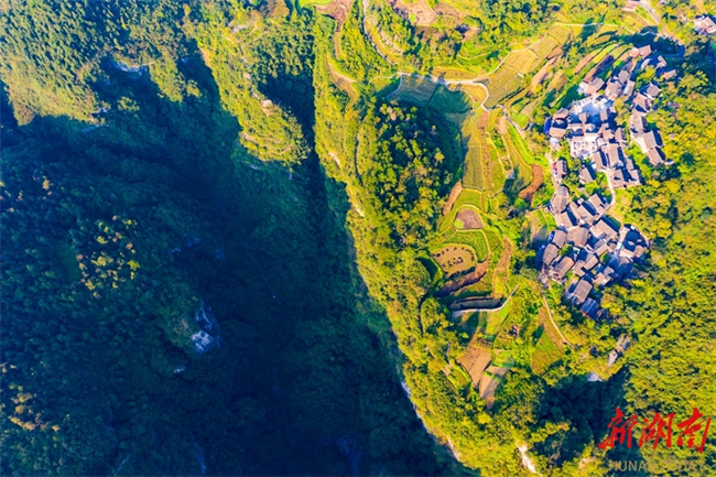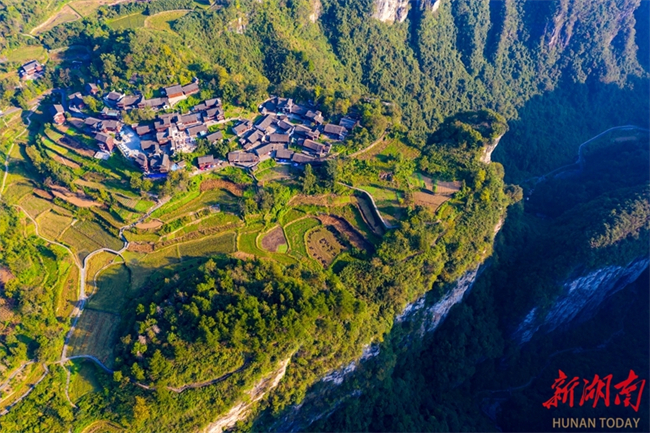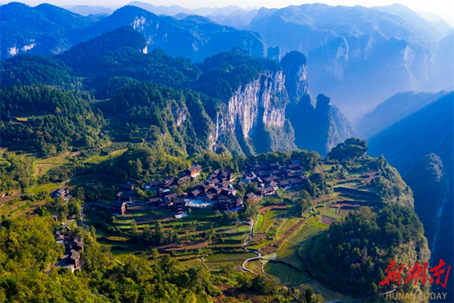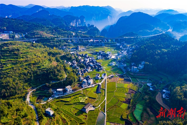 In Paixiong Village, Aizhai Town, Jishou City, the local dwellings, fields, and remote mountains add beauty to each other, creating a picturesque scenery. (Photo/Liu Zhenjun)