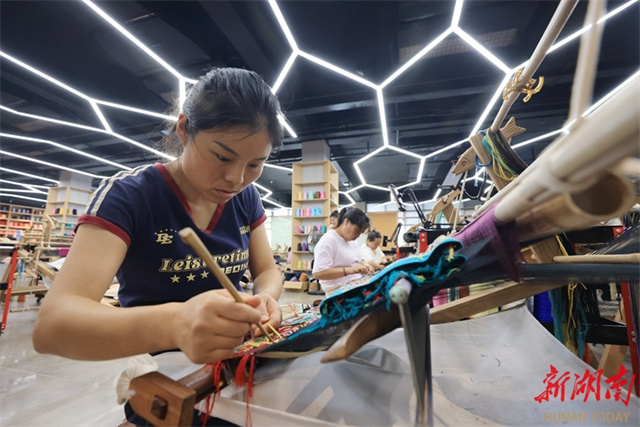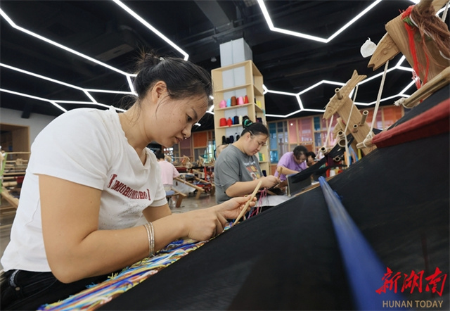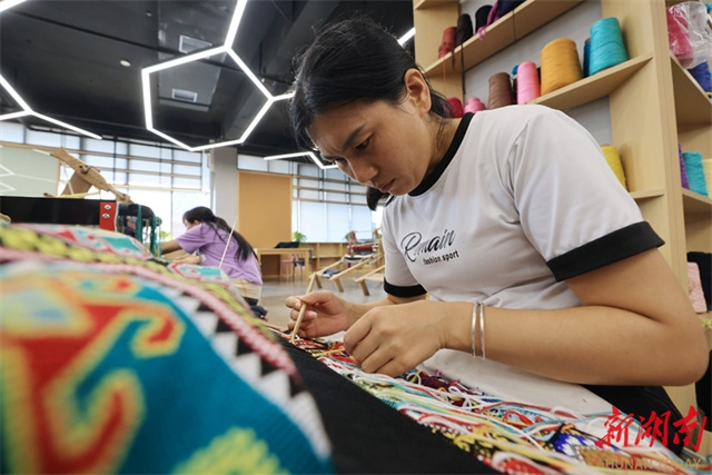 The photo shows workers creating Tujia brocade products at a Tujia brocade production and R&D base in Zhangjiajie City. To meet autumn and winter market demand, Tujia brocade enterprises across the city are actively innovating product designs, launching customized products such as double-sided brocade shawls and scarves. Companies are operating at full capacity to fulfill orders, ensuring timely supply of new products. (Photo/Wu Yongbing)