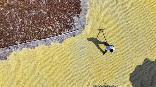 An aerial drone photo taken on Oct. 11, 2025 shows a farmer spreading rice to dry in Lanjiang Township, Changning City, central China's Hunan Province. [Photo/Xinhua]