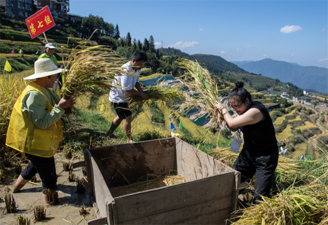 On October 10, the 2025 Shanbei Terraced Fields Farming Culture Competition was held in Shanbei Village, Gezhuping Town, Xupu County. The event integrated elements of traditional farming, ethnic culture, and modern competition. It featured distinctive activities like "Threshing Race," and "Sprint Race in the Mud," attracting many visitors. The photo shows a threshing race. (Photo/Lei Wenlu and Chen Dasen)