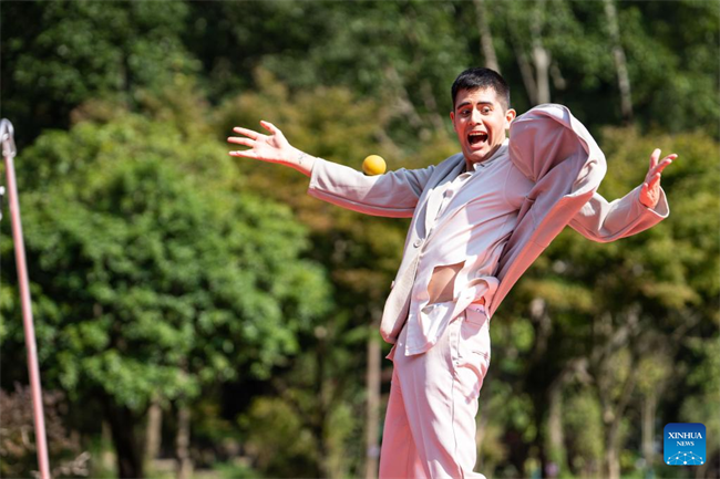 An acrobat from Chile performs during the 2025 Zhangjiajie International New Acrobatic Theater Festival at the Zhangjiajie National Forest Park in Zhangjiajie, central China's Hunan Province, Oct. 11, 2025. The event kicked off in Zhangjiajie on Saturday, with the participation of acrobats from more than ten countries and regions including France, Russia, Germany, Italy, and Chile. Over 60 shows will be presented during the five-day event, integrating elements of drama, dance, music, and new media. (Xinhua/Chen Sihan)
