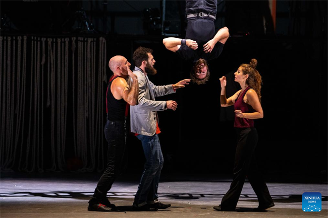 Acrobats perform during the 2025 Zhangjiajie International New Acrobatic Theater Festival in Yongding District of Zhangjiajie, central China's Hunan Province, Oct. 11, 2025. The event kicked off in Zhangjiajie on Saturday, with the participation of acrobats from more than ten countries and regions including France, Russia, Germany, Italy, and Chile. Over 60 shows will be presented during the five-day event, integrating elements of drama, dance, music, and new media. (Xinhua/Chen Sihan)