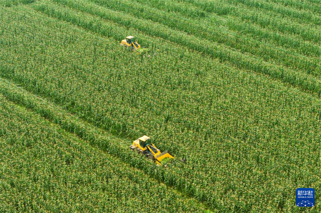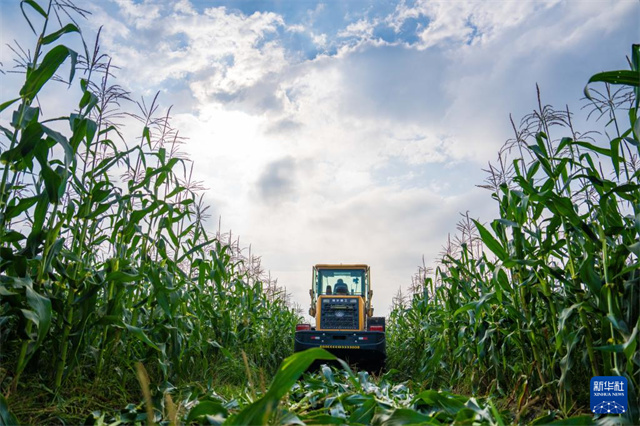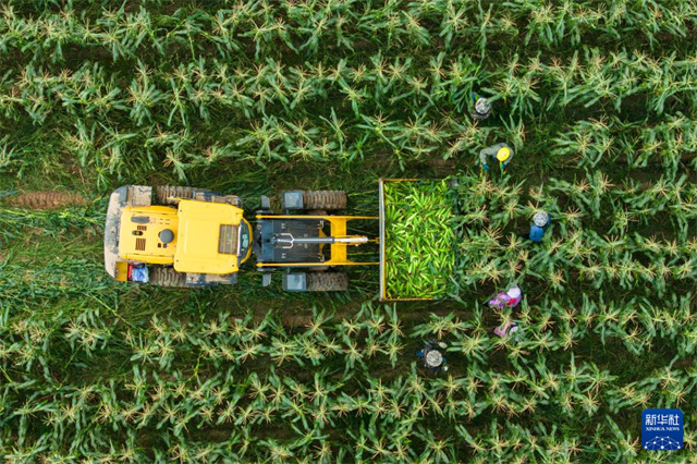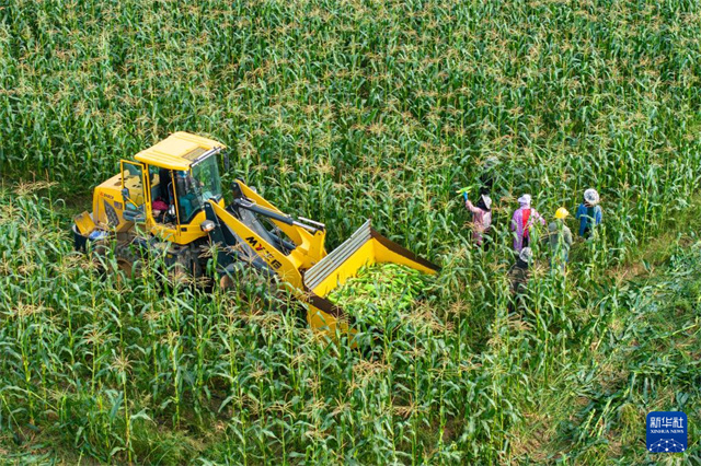 The aerial photo shows a villager operating a loader to transfer freshly harvested sweet corns onto a truck in Xin'an Village, Huage Town, Nanxian County. (Photo/Chen Sihan)
