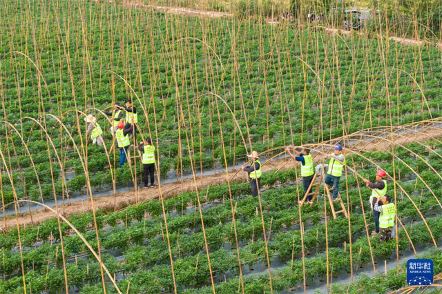 The aerial photo shows villagers building greenhouses in Xin'an Village, Huage Town, Nanxian County. (Photo/Chen Sihan)