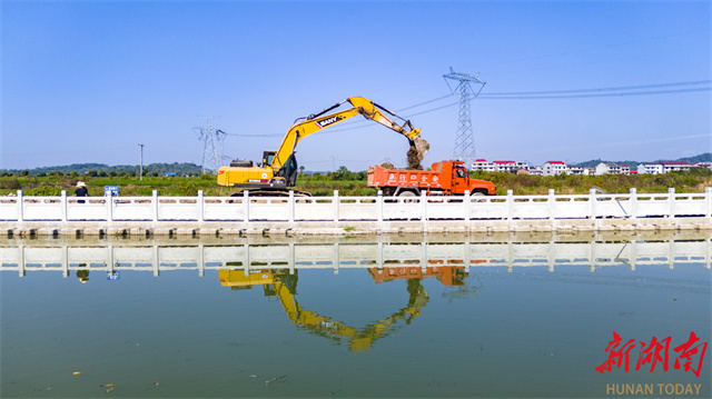 In recent years, the Lianyuan City Authority has focused on river ecological management, advancing a series of measures such as promoting ecological restoration, improving water quality, and fostering shared benefits for residents. These efforts have created an ecological environment characterized by "smooth rivers, clear waters, and beautiful scenery." The photo shows construction vehicles clearing debris along the Sunshui River section in Jinpen Village, Yangshi Town, Lianyuan City. (Photo/Wu Yonghua)