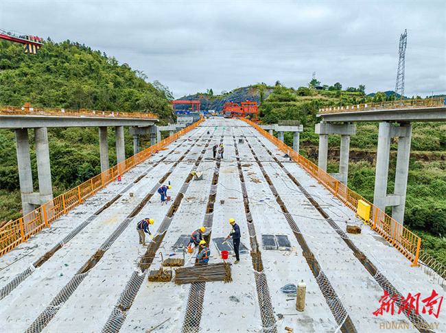 The photo, taken on October 21, shows workers hard at work on the construction site of the Jishou-Huaihua Expressway Jinping Interchange Hub in Jishou City. Upon opening to traffic, this project will significantly enhance the connectivity efficiency of the regional expressway network, improve the transportation conditions, and inject new momentum into the development of local economy. (Photo/Peng Jing)