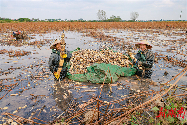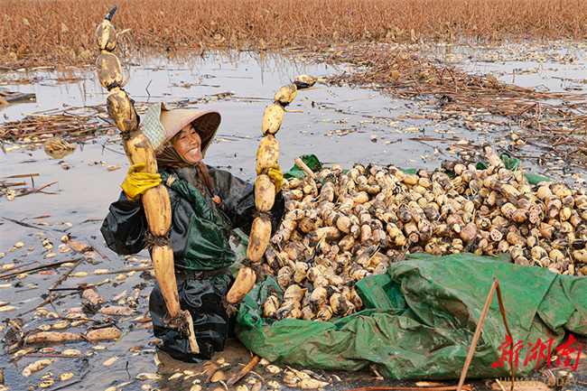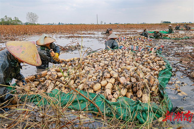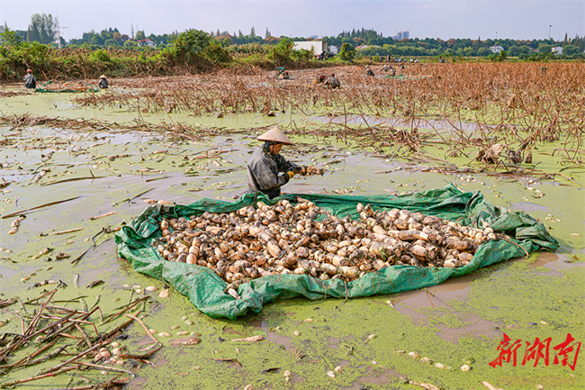 The lotus roots in Youdong Village, Wuzui Township, Nanxian County have entered the harvest season in recent days. Villagers are seizing the time to harvest fresh lotus roots, to ensure in-time supply to the market and secure a bumper harvest. In recent years, Nanxian County has leveraged its water and land resources to develop "lotus root + crayfish" and "lotus root + fish" ecological farming modes. This initiative helps enhance the collective economy of the village while increasing villagers' income. The photo shows villagers harvesting lotus roots in a pond in the village. (Photo/Xiao Lefeng)