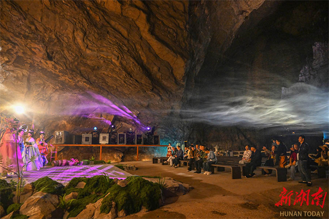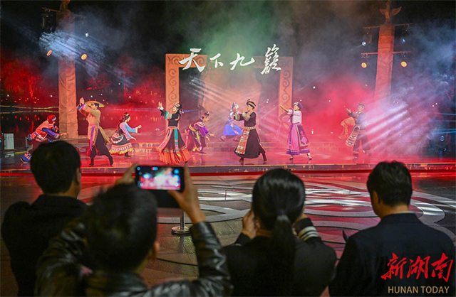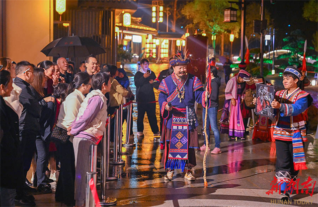 On the evening of October 22, a grand real-scene performance themed Jiuyi Mountain was staged at the Nanfengji Cultural Tourism Commercial Complex in Jiuyi Mountain Scenic Area, Ningyuan County, attracting crowds of visitors. In recent years, the scenic area has centered on the culture of Emperor Shun to innovatively interpret traditional culture through technological means. It has created immersive cultural and tourism experiences to boost the deep integration of the cultural and tourism industries. (Photo/Guo Liliang and Tong Zhenxi, Hunan Daily)