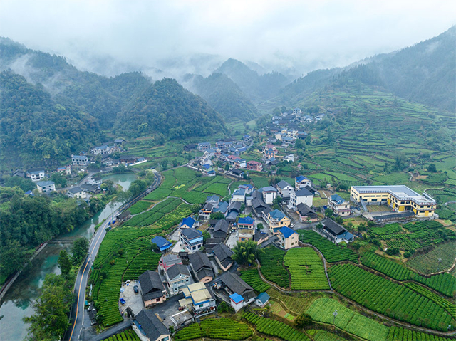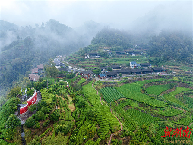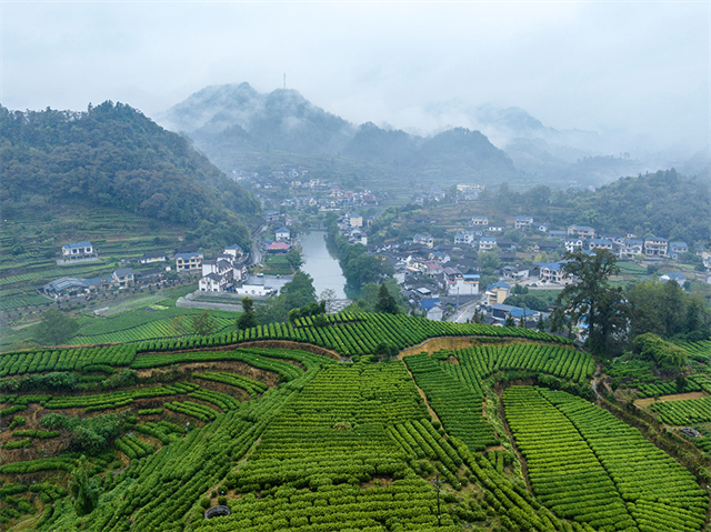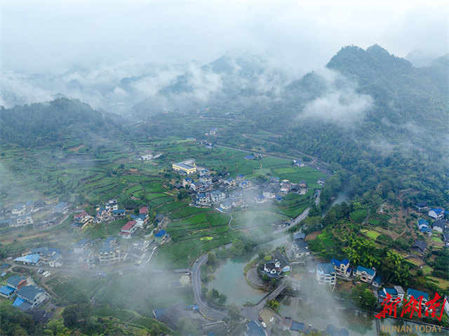 On October 30, Aikou Village in Majing'ao Town, Jishou City was shrouded in autumn rain. Tea plantations, villages, rivers, and green mountains intertwined in the misty rain, together composing a poetic ecological landscape. (Photo/Peng Jing)