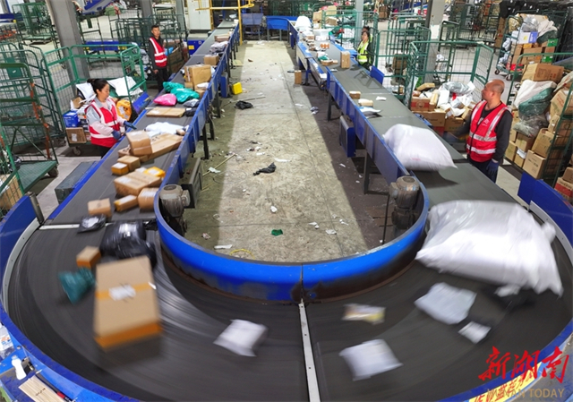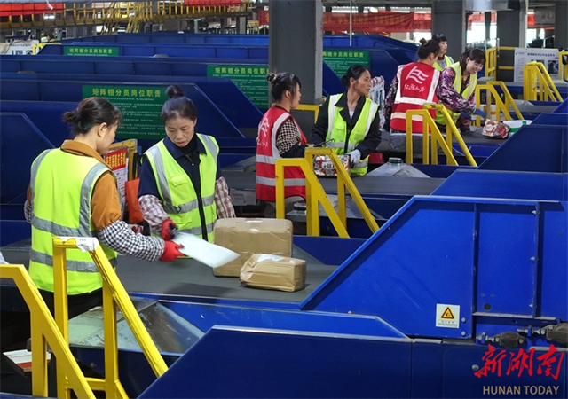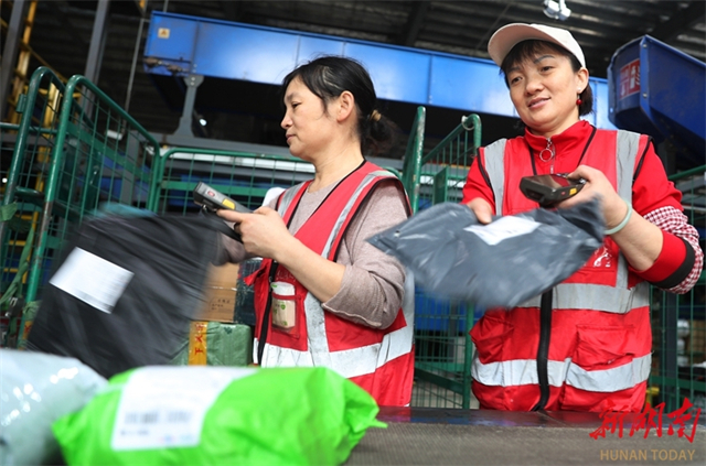 On November 2, staff members are busy sorting express parcels on the conveyor belt at the mail processing center of the Hengyang Postal District Center of China Post Group Co., Ltd. Multiple e-commerce platforms have launched concentrated promotional campaigns since the beginning of this month, bringing a small peak in delivery volume for logistics departments. The center has implemented a rotating shift system to ensure that express parcels will be sorted immediately upon arrival. (Photo/Cao Zhengping and Xu Fang)
