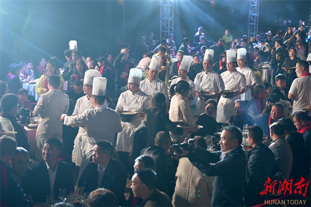 The Shanhe Village Authority hosted the Xiangsong Harvest Festival on November 1. The event featured immersive agricultural cultural experiences, including terraced field tours, fish catching in paddy fields, rice harvesting and threshing, a field banquet, and a bonfire party. The photo shows a team of professional chefs serving up delicacies for guests during a field banquet at Shanhe Village, Suoshi Town, Shuangfeng County. (Photo/Li Jianxin)