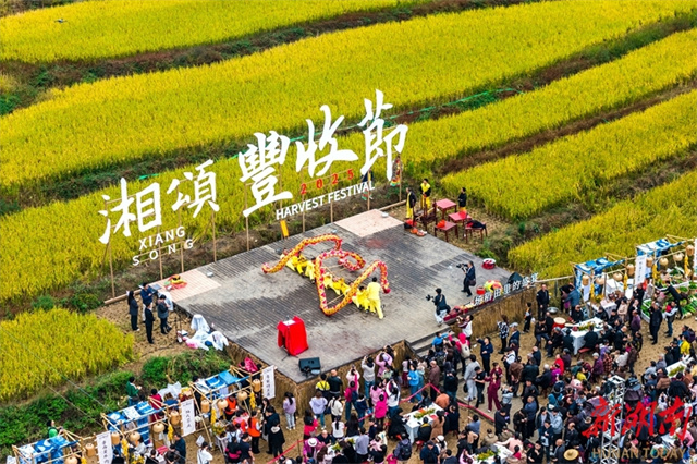 The Shanhe Village Authority hosted the Xiangsong Harvest Festival on November 1. The event featured immersive agricultural cultural experiences, including terraced field tours, fish catching in paddy fields, rice harvesting and threshing, a field banquet, and a bonfire party. The photo, taken November 1, shows villagers performing a dragon dance at Shanhe Village, Suoshi Town, Shuangfeng County. (Photo/Li Jianxin)
