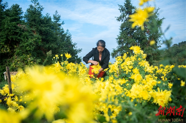 On November 4, a farmer harvests golden chrysanthemums at a plantation in Huangli Village, Huquan Town, Lianyuan City. In recent years, the city has revitalized land resources by adopting a "company-plantation-farmer" model to develop the golden chrysanthemum industry. It has established online and offline sales platforms to integrate production and marketing, thereby effectively boosting employment and incomes for local farmers. (Photo/Wu Yonghua)