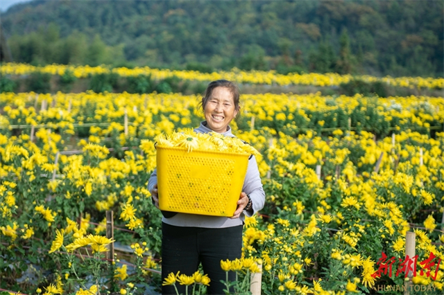 On November 4, a farmer presents golden chrysanthemums at a plantation in Huangli Village, Huquan Town, Lianyuan City. In recent years, the city has revitalized land resources by adopting a "company-plantation-farmer" model to develop the golden chrysanthemum industry. It has established online and offline sales platforms to integrate production and marketing, thereby effectively boosting employment and incomes for local farmers. (Photo/Wu Yonghua)
