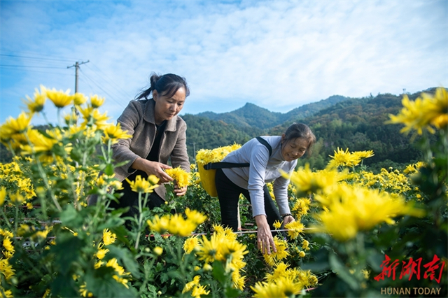On November 4, farmers harvest golden chrysanthemums at a plantation in Huangli Village, Huquan Town, Lianyuan City. In recent years, the city has revitalized land resources by adopting a "company-plantation-farmer" model to develop the golden chrysanthemum industry. It has established online and offline sales platforms to integrate production and marketing, thereby effectively boosting employment and incomes for local farmers. (Photo/Wu Yonghua)