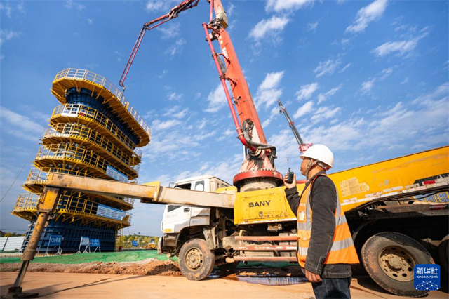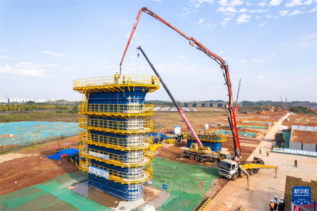The photo, taken on November 5, shows workers from the China Railway No. 5 Engineering Group carrying out pier pouring operations at the construction site of the Airport Expressway Super Bridge on the Changsha-Ganzhou High-speed Railway. (Photo/Chen Sihan, Xinhua)