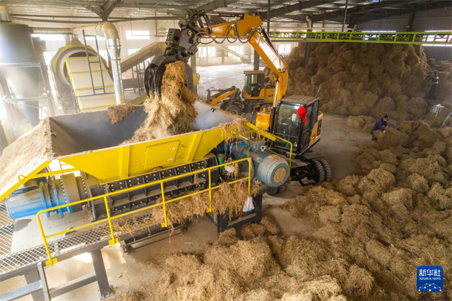 The photo, taken on November 5, shows a worker arranging processed straw feed at a workshop of Changsha Xuanfan Agricultural Development Co., Ltd. in Kaihui Town, Changsha County. (Photo/Chen Sihan, Xinhua)