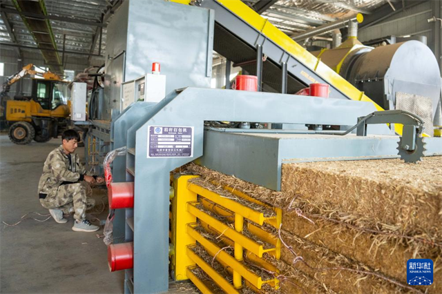 The photo, taken on November 5, shows a worker operating a straw baler at a workshop of Changsha Xuanfan Agricultural Development Co., Ltd. in Kaihui Town, Changsha County. (Photo/Chen Sihan, Xinhua)