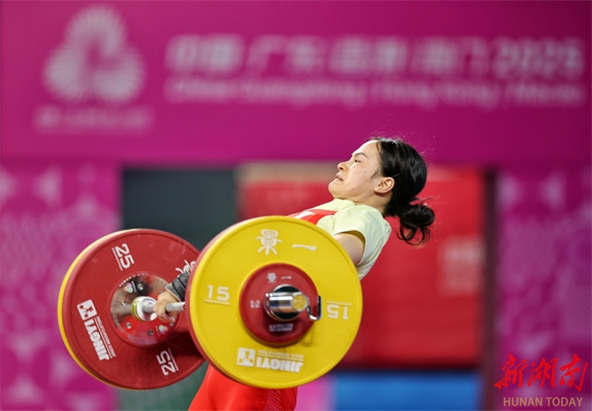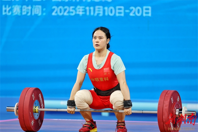 Luo Shifang, a weightlifting champion in the Paris 2024 Olympic Games and a member of the Zoomlion-supported Hunan Weightlifting Team, claimed the gold medal in the weightlifting women's 59kg final at China's 15th National Games on the evening of November 11. She lifted 105kg in the snatch and 130kg in the clean and jerk, achieving a winning total of 235kg. (Photo/Fu Cong, Hunan Daily)