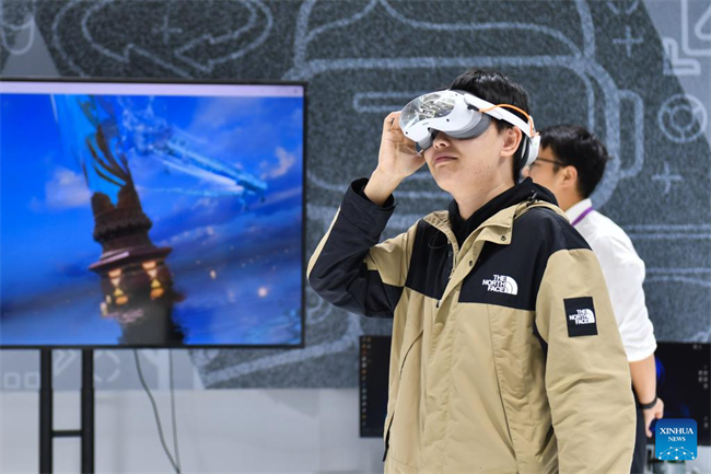 Visitors experience VR equipments during the 2025 China New Media Technology Exhibition in Changsha, capital of central China's Hunan Province, Nov. 12, 2025. The 2025 China New Media Conference, featuring an opening ceremony, 7 parallel forums, China New Media Technology Exhibition and 5 other events, kicked off here on Wednesday. (Xinhua/Chen Zhenhai)