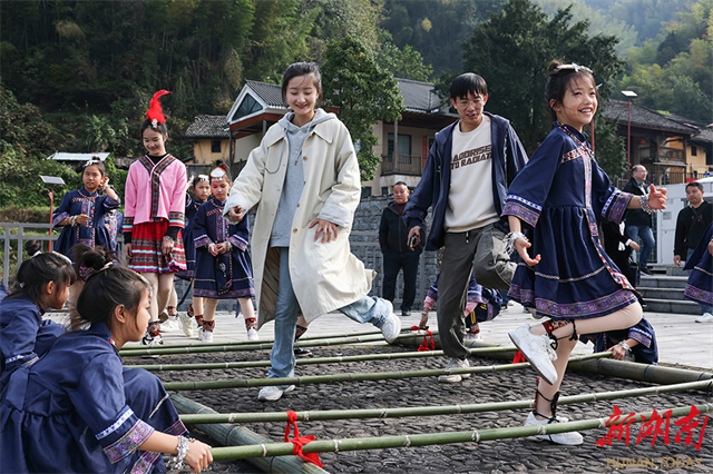 On November 17, tourists experienced the bamboo pole dance in Taoyuanping Village, Xishan Yao Township, Linwu County, Chenzhou City. The township authority held a folk event to celebrate a bumper harvest, showcasing the new look of the Yao ethnic township and the joy of the harvest through cultural performances and specialty product exhibitions. (Photo/Chen Weiping)