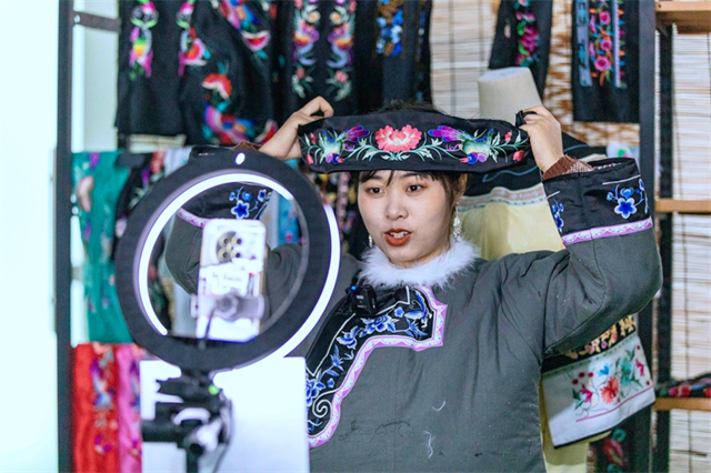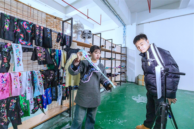 Young entrepreneurs from a Miao brocade clothing store promote their products through live streaming at the Luggage and Apparel Industrial Park, Jishou Economic and Technological Development Zone. In recent years, this startup team has been actively exploring an innovative development model combining online livestreaming with offline engagement, leveraging e-commerce platforms to expand the market reach of traditional Miao clothing culture. (Photo/Peng Jing)